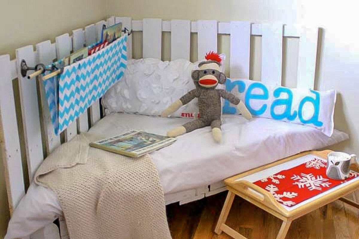 Fabriquée à partir de palettes, cette banquette d’angle crée un coin lecture idéal pour les enfants. Installée contre deux murs, elle optimise l’espace tout en offrant une ambiance douce et réconfortante. Les planches peintes en blanc servent de dossier et de structure, tandis qu’un matelas moelleux et quelques coussins transforment l’ensemble en petit cocon. L’idée est aussi pratique qu’esthétique : les palettes se fixent aisément et leur hauteur naturelle correspond bien à celle d’un siège enfant.