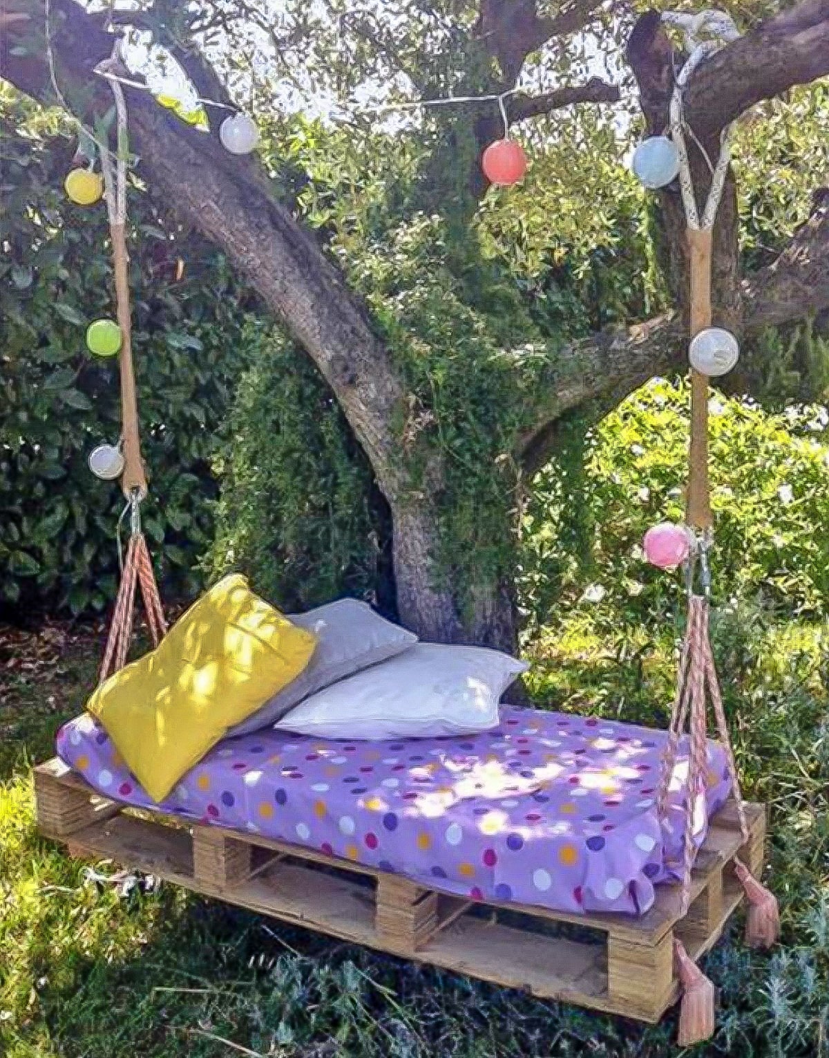 Rien de plus poétique qu’une palette suspendue pour créer un coin détente au jardin. Ici, la palette sert de support à un matelas coloré, maintenu par de solides cordes fixées à une branche. L’ensemble forme une balancelle douce, parfaite pour lire, se reposer ou observer les nuages. Quelques coussins, une guirlande lumineuse et le tour est joué : le mobilier devient décoration et refuge suspendu.