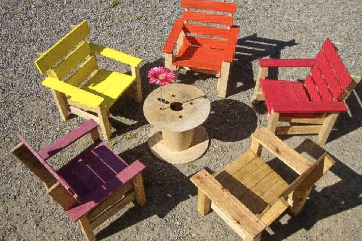 Sur la deuxième image, la même idée se décline en plusieurs chaises colorées autour d’une table faite à partir d’un ancien touret de câble. Chaque siège arbore une couleur différente (rouge, jaune, violet, bois naturel) créant une ambiance ludique. Ces meubles invitent à la créativité et à la convivialité : on peut les fabriquer ensemble, les peindre à quatre mains, puis s’y installer pour dessiner ou goûter. C’est une façon durable d’aménager un espace extérieur pensé pour les enfants, mais apprécié aussi des grands.