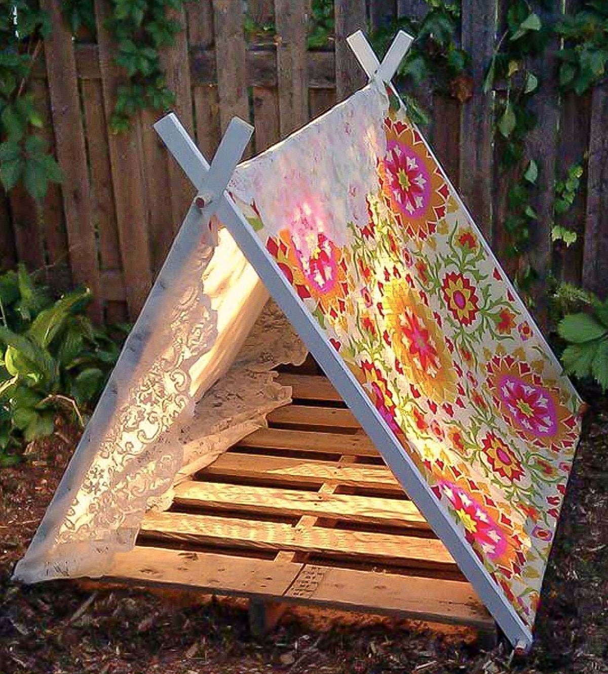 Facile à construire et pleine de charme, cette petite tente combine l’esprit cabane et le confort d’un coin lecture d’été. La base, réalisée avec une palette en bois, forme un plancher stable qui isole du sol. Deux cadres en bois disposés en A soutiennent un tissu coloré et léger, ici un mélange de dentelle et de motifs fleuris, qui laisse passer la lumière tout en créant une atmosphère douce et intime. En quelques minutes, le jardin se transforme en aire de jeu, en abri secret ou en coin lecture à ciel ouvert.