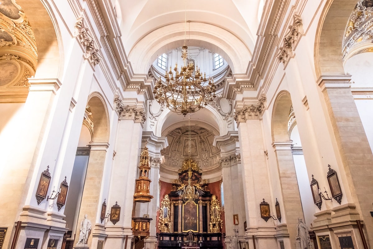 À partir du XVIIᵉ siècle, Cracovie suit le mouvement baroque européen. Les façades d’églises gagnent en relief, avec colonnes engagées, niches, corniches puissantes. Les intérieurs se couvrent de stucs, de dorures, de fresques illusoires qui agrandissent l’espace. On le voit dans plusieurs églises de la route royale, entre la porte Saint-Florian et Wawel, où l’on passe devant des portails très travaillés, parfois presque théâtraux. Les contrastes de lumière renforcent encore cet effet en franchissant le seuil.