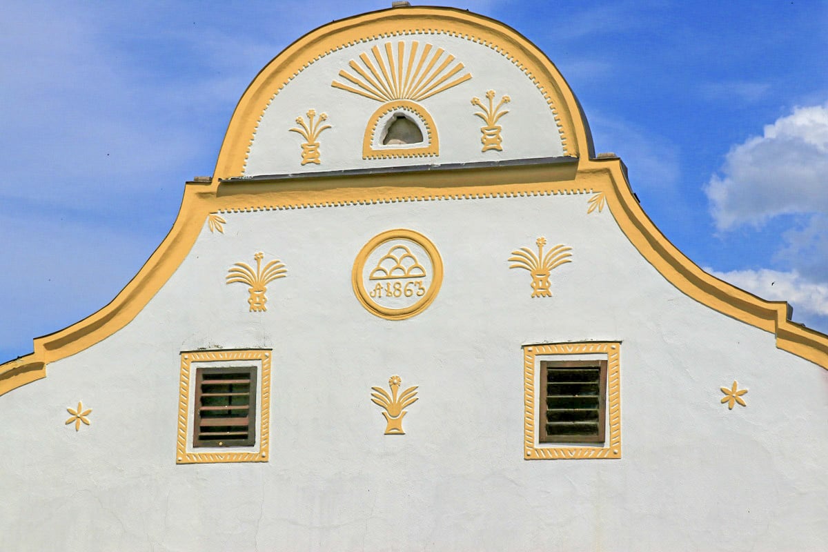 C’est ce qu’on appelle le « baroque rural » ou « baroque paysan » (selské baroko en tchèque), un style qui a marqué les villages de la région au XIXᵉ siècle. Les maisons sont celles de paysans, mais leur peau change : décor de stuc, colonnes en relief, inscriptions, couleurs pastel. Dans certains villages, tout le tour de la place adopte ce langage architectural, ce qui donne une impression très forte de cohérence.