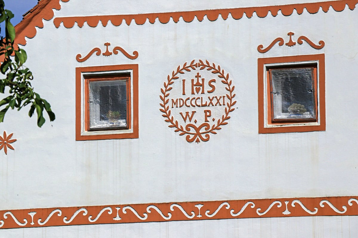Dans les villages de Bohême du Sud, le pignon des habitations devient une sorte de carte de visite familiale. Les sources locales décrivent un vocabulaire récurrent : pilastres en relief, frontons curvilignes, petits obélisques, vases, croix, symboles religieux, parfois des sapins stylisés.