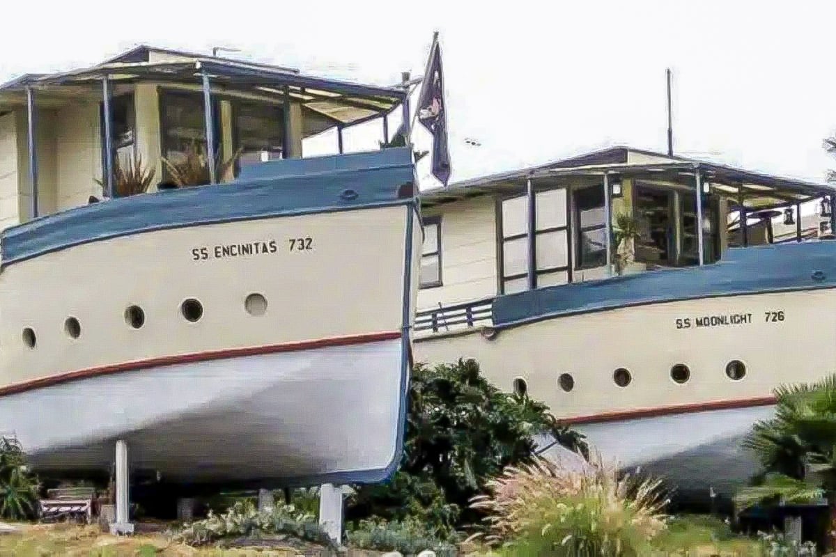 À Encinitas, non loin de Moonlight Beach, deux silhouettes improbables dominent encore le paysage : le S. Encinitas et le S.S. Moon Light. Ces « navires » ne sont pas d’anciens bateaux recyclés, mais des répliques architecturales construites en 1928 par Miles Kellogg, un ingénieur à la retraite fasciné par le monde maritime. Leur proue, leurs rangées de hublots et leurs superstructures évoquent les paquebots et cargos du début du XXᵉ siècle, au point de donner l’illusion d’un chantier naval près de l’océan.