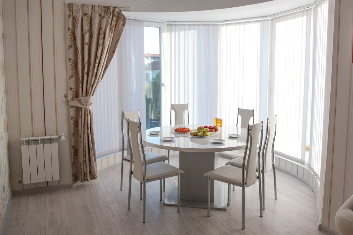 Dans une salle à manger, l’effet peut être remarquable. Une table installée dans cette avancée profite d’un éclairage généreux et d’un rapport plus direct au jardin ou à la rue. Le repas change d’ambiance.