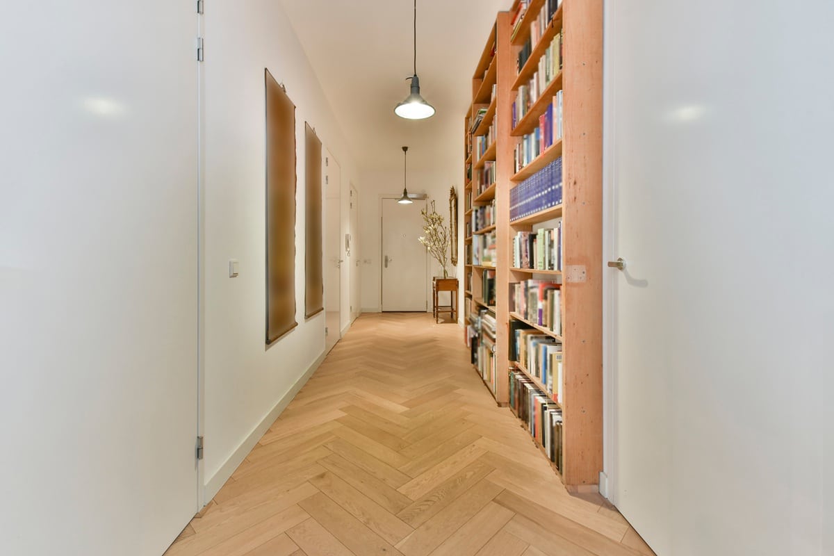 L’extrémité d’un couloir est très souvent laissée vide, faute d’idée. Pourtant, une colonne étroite ou une bibliothèque peu profonde y trouve facilement sa place. Le dessus des portes, rarement utilisé, peut accueillir des étagères discrètes pour du rangement occasionnel.