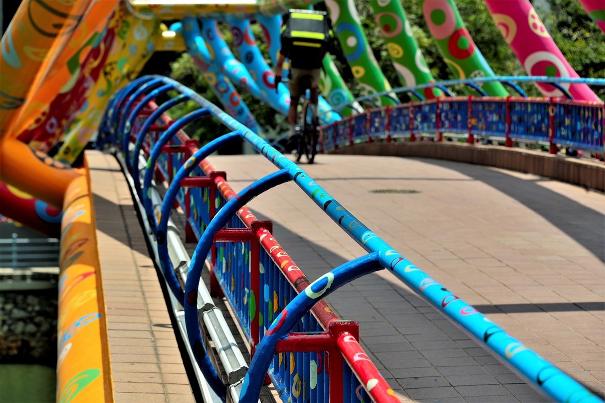 Le pont Alkaff enjambe la rivière Singapour à Robertson Quay, un quartier connu pour ses promenades tranquilles et ses cafés en bord d’eau. Conçu par l’artiste philippine Pacita Abad, ce pont se distingue immédiatement par son esthétique festive et singulière. Pacita et son équipe ont appliqué 52 couleurs vives différentes et utilisé plus de 900 litres de peinture pour donner vie à cette œuvre spectaculaire. Le résultat est un passage piéton transformé en installation artistique à ciel ouvert, qui illumine le paysage urbain et rend hommage à la créativité et au multiculturalisme de Singapour.