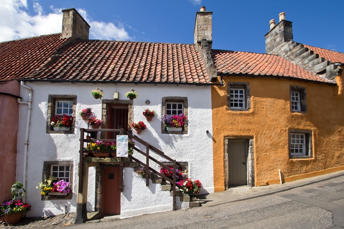 À Culross, l’image “carte postale” vient surtout des murs harlés (enduit traditionnel) souvent blanchis ou très clairs, associés aux toits en tuiles rouges (pantiles), mais l’ensemble n’est pas uniformément blanc. On observe également des façades ocre (le palais de Culross en est l’exemple le plus célèbre) et des variations de tons et de textures liées aux enduits, aux reprises et à la pierre apparente, ce que souligne aussi l’analyse du secteur protégé : l’unité se fait par les matériaux et les volumes (harl clair + pantiles rouges + pignons à redents), tandis que la rue conserve une vraie diversité de détails.