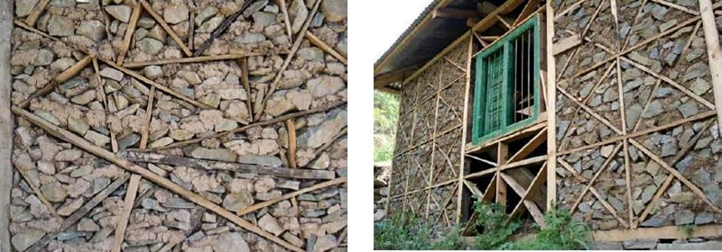 - Dhajji-diwari : ossature bois contreventée + remplissage maçonné.
