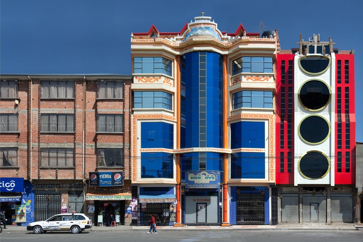 La ville est aussi très jeune. Sa croissance date des années 1980 et continue encore aujourd’hui. Le téléphérique, mis en service dans les années 2010, a changé la vie : il relie en quelques minutes El Alto et La Paz. Ce lien rapide a renforcé l’économie locale et donné plus de visibilité à ses habitants. C’est dans ce contexte d’ascension sociale et de confiance nouvelle qu’a émergé une architecture propre à El Alto, immédiatement reconnaissable par ses couleurs et ses formes géométriques.