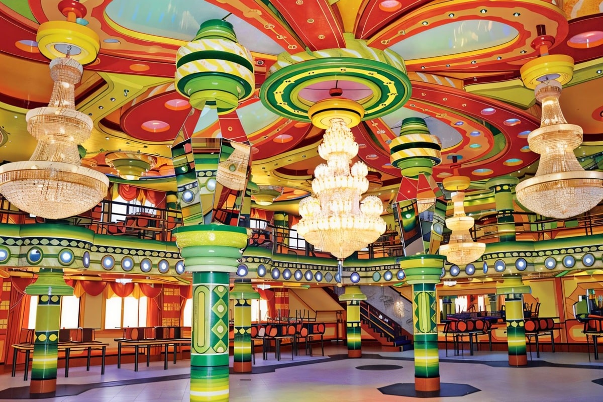 Vous poussez la porte d’un salon de réception. Le sol dessine des cercles et des vagues. Les colonnes portent des chapiteaux en forme de fleurs. Les plafonds reprennent des rosaces en relief, souvent avec un grand lustre au centre. Une mezzanine court sur le pourtour. La lumière latérale passe par de hautes baies, parfois teintées. Les escaliers affichent des rampes métalliques brillantes. L’ambiance prépare la fête avant l’arrivée des invités. (Regardez les salles en journée : vous y verrez surtout des équipes qui dressent les tables et tendent les nappes bleues et blanches, prêtes pour le soir.)