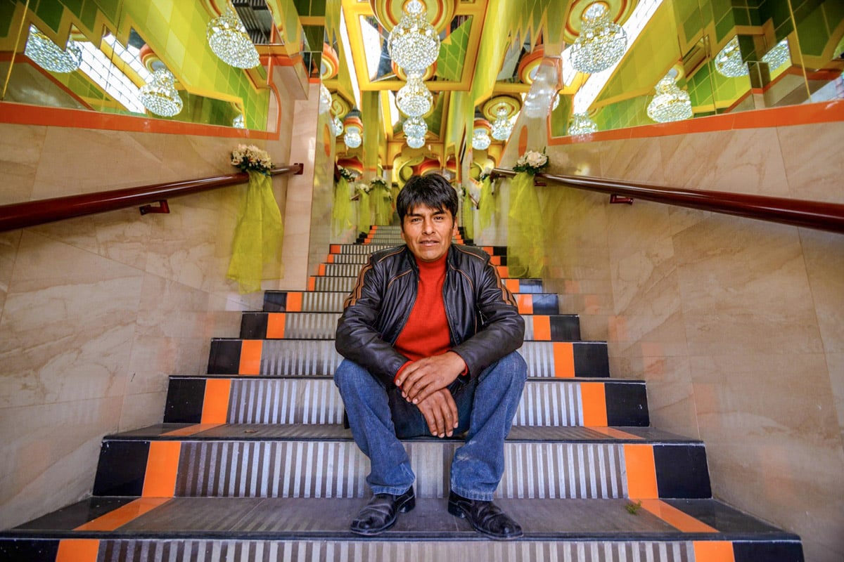 Fils de maçon, formé comme ingénieur civil, Freddy Mamani a bâti plus de soixante édifices dans ce style à El Alto depuis le milieu des années 2000. Il dessine en s’inspirant de motifs aymaras : la croix andine (chakana), les géométries de Tiwanaku, les cercles, la répétition, et les tons des tenues des cholitas.