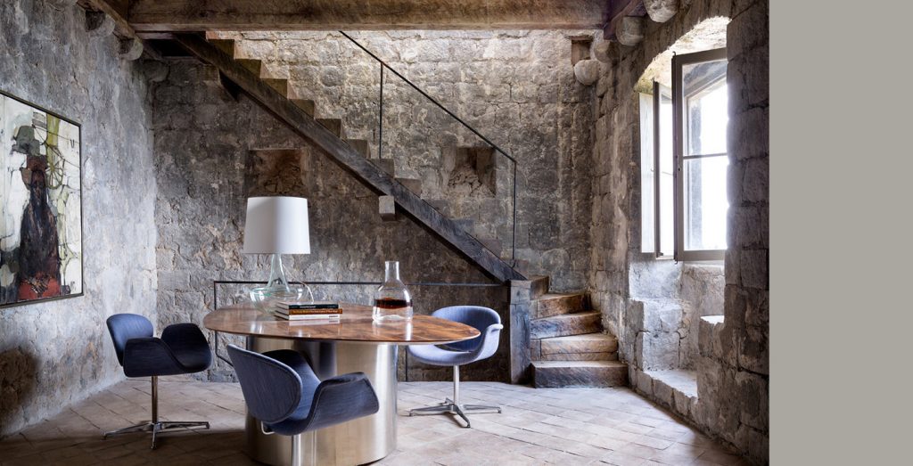 En 2005, l’architecte Steven Harris et son partenaire, un architecte d’intérieur, Lucien Rees Roberts, ont acheté un complexe à quatre structures sur une petite île de la côte dalmate de la Croatie. Le domaine comprend également une tour forteresse du 15ème siècle, un monument historique classé qu’ils ont passé deux ans à rénover. Selon Architectural Digest, la forteresse de cinq étages avait une « citerne au premier étage pour fournir de l’eau à ses défenseurs lors d’une attaque, plus une cheminée au dernier étage pour chauffer l’huile bouillante à déverser sur les envahisseurs ». Aujourd’hui, l’endroit est décidément plus paisible, parsemé d’un mélange réfléchi de meubles du milieu du siècle.