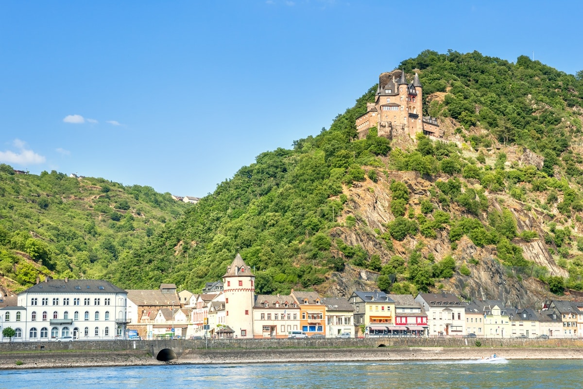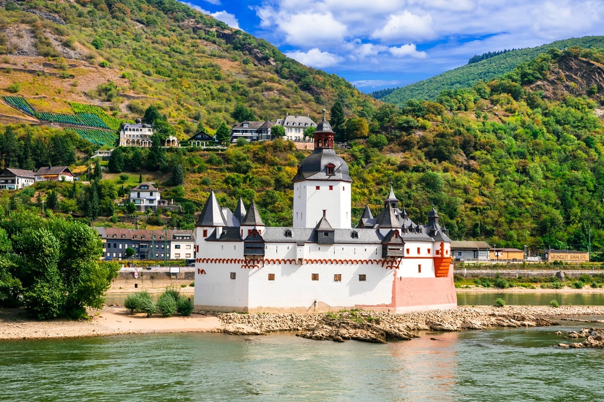 Kaub est l’un des plus petits arrêts de la vallée, et pourtant l’un des plus marquants. Le village lui-même est assez petit, avec quelques rues et des maisons regroupées au bord du Rhin. Mais très rapidement, le regard est attiré par un élément unique : le château de Pfalzgrafenstein, posé sur une île au milieu du fleuve. Cette position inhabituelle en fait une image forte, immédiatement identifiable.