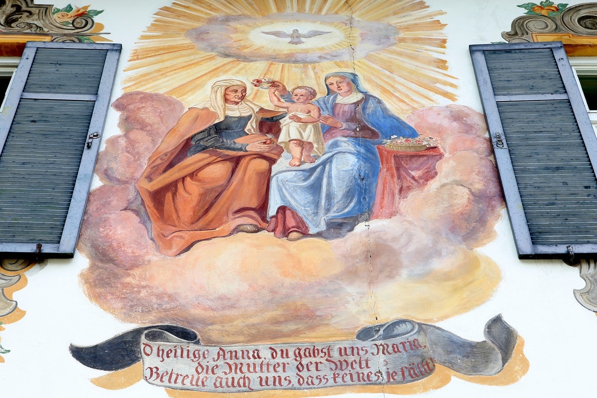 Située au pied du Karwendel, cette petite ville est célèbre pour sa tradition de lutherie, au point qu’on la surnomme « la ville du violon ». Mais ses façades peintes sont un autre attrait. Dès le XVIIIe siècle, des programmes entiers de Lüftlmalerei y ont été commandés par des familles d’artisans et de commerçants prospères. Le visiteur y découvre un mélange entre architecture feinte (colonnes, corniches, balustrades) et de vastes fresques religieuses qui transforment les rues en véritables galeries à ciel ouvert.