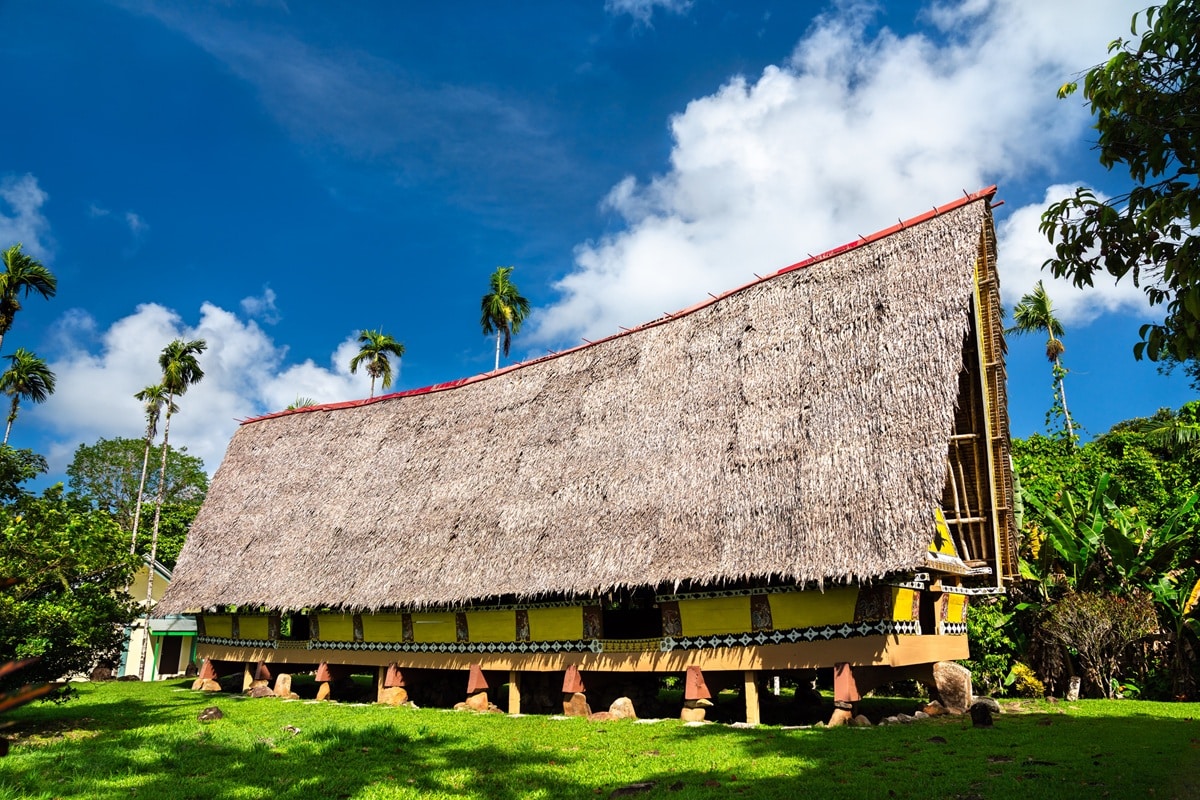 La construction d’un bai mobilisait l’ensemble de la communauté. Les bois durs, souvent issus de l’arbre à pain ou du bois de fer, provenaient des forêts environnantes, tandis que les feuilles de palmier nipa servaient à couvrir la toiture. Aucune pièce métallique n’était utilisée : les assemblages reposaient sur des tenons, mortaises et ligatures de fibres végétales, dans un strict respect de la tradition.