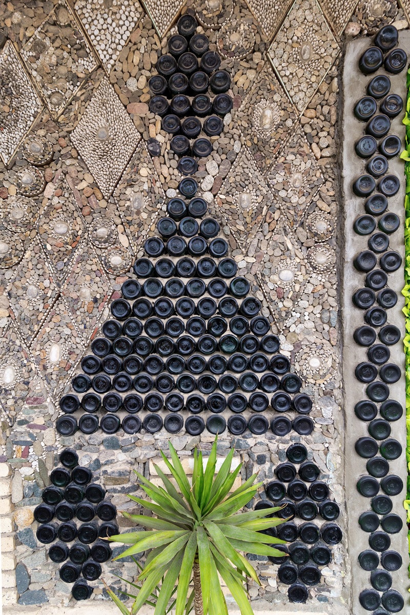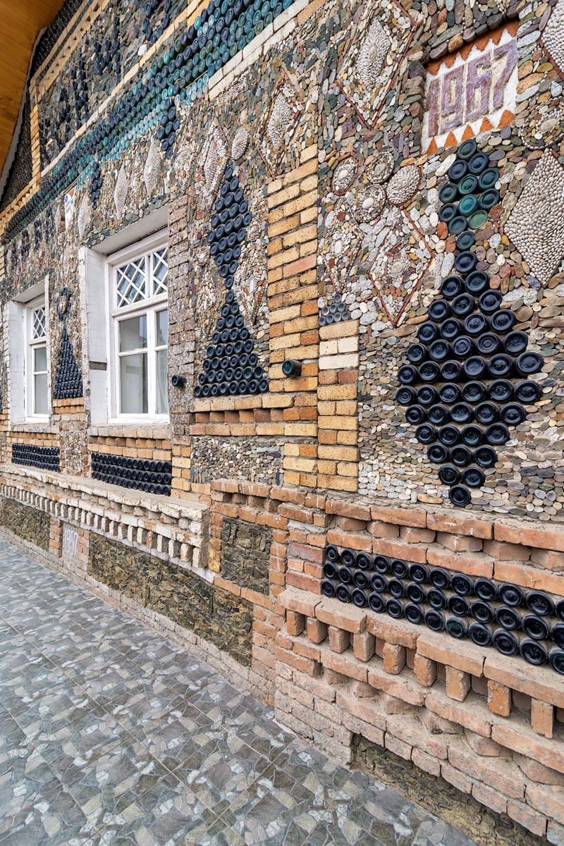 La maison se caractérise par une décoration totalement atypique. En effet, des mosaïques composées de fonds de bouteilles et de tessons de verre forment :
