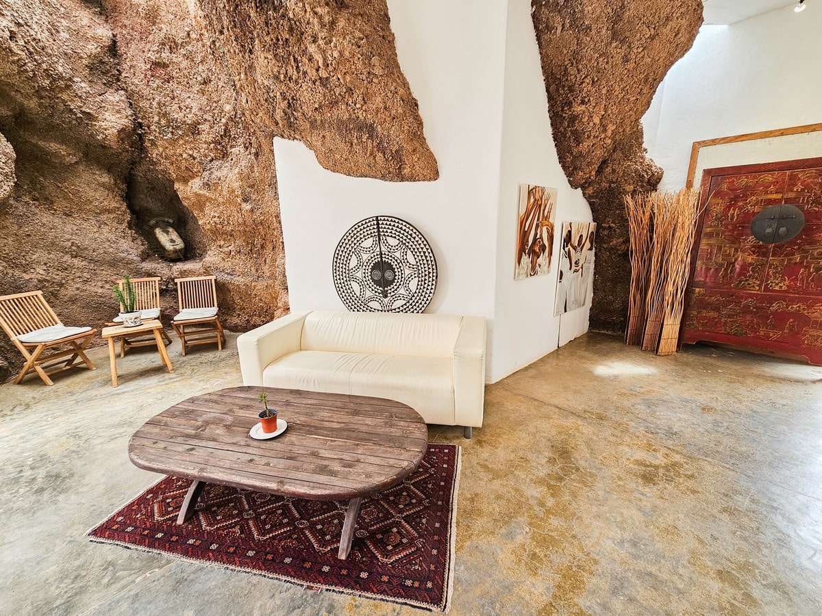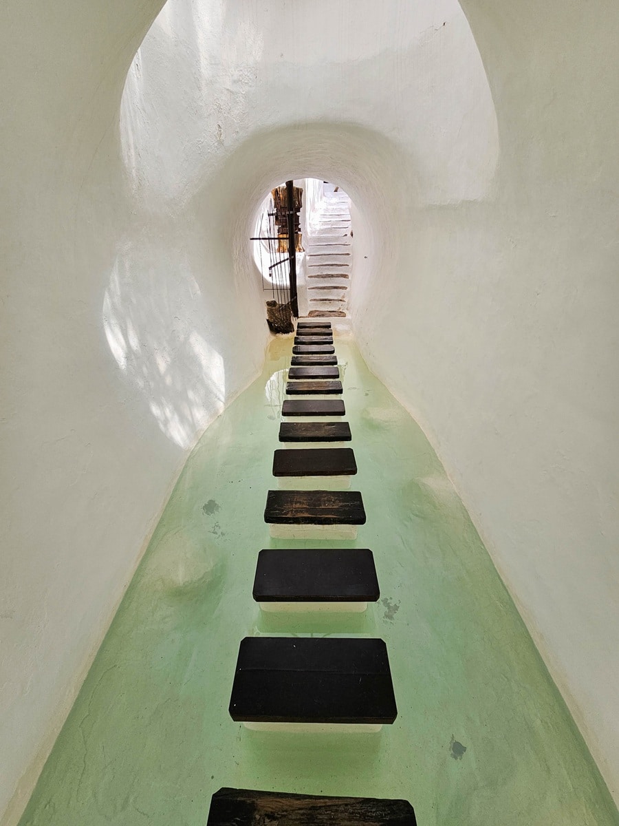 LagOmar n’est pas pensée comme une suite de pièces alignées. Elle fonctionne par séquences. Le visiteur passe d’un espace resserré à une terrasse ouverte. Il quitte une paroi sombre pour déboucher sur une surface blanche inondée de lumière. Il monte, redescend, bifurque, revient presque sur ses pas. Cette écriture est volontaire : le lieu fabrique du suspense, du rythme, des surprises.