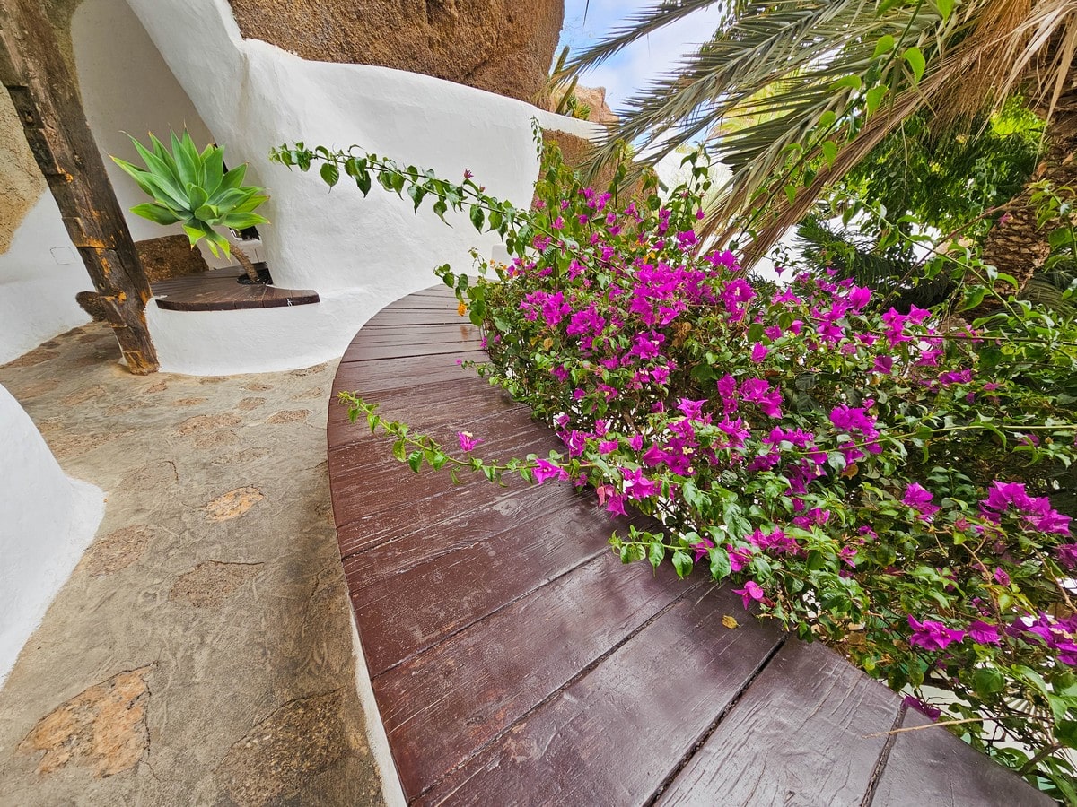La végétation est locale : cactus, euphorbes, palmiers, aloès, bougainvilliers. Ce sont des plantes capables de vivre dans la chaleur et le vent. Elles structurent aussi la promenade : un écran de feuillage masque un passage, une floraison attire l’œil, un alignement de cactus guide vers un escalier.