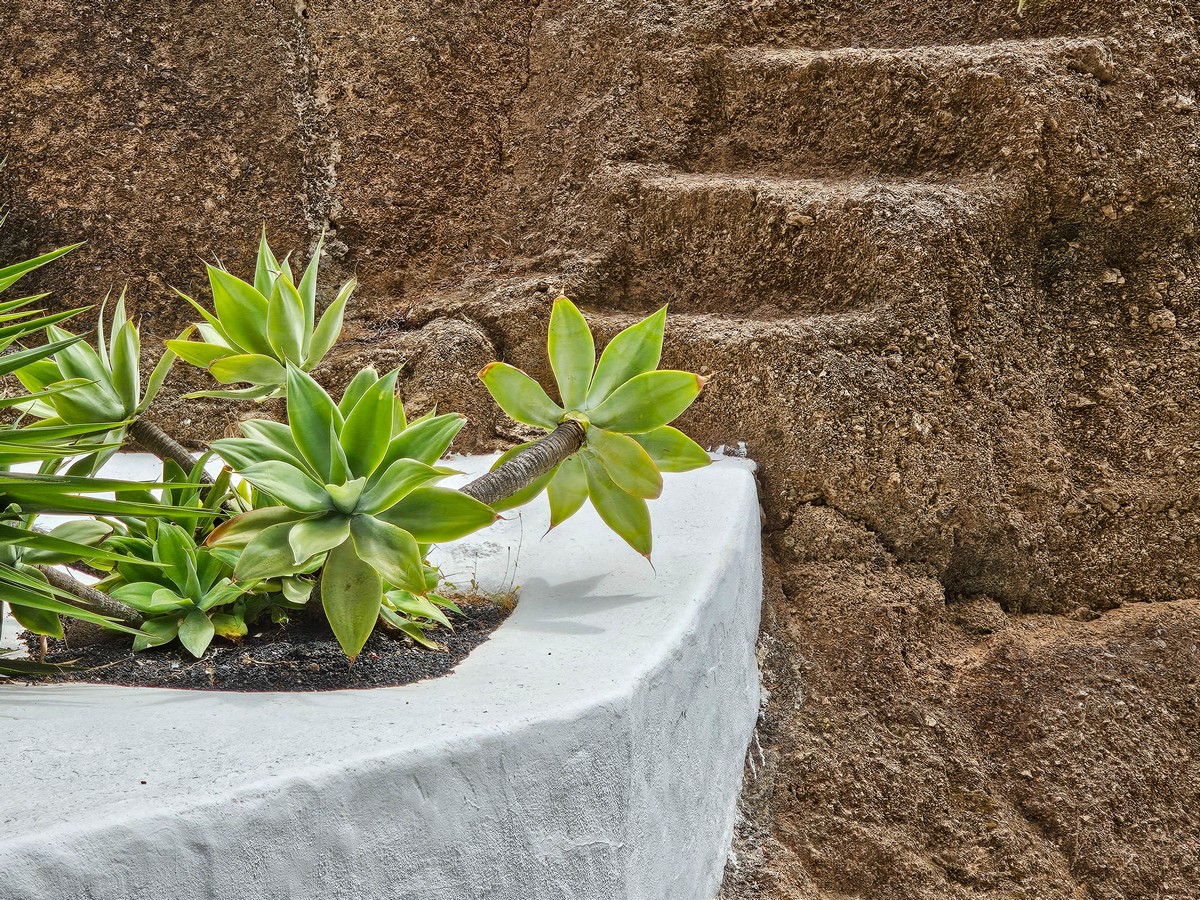 Dans ce jeu de matières, la lumière devient un matériau à part entière. Lanzarote offre un soleil dur, un ciel souvent sans filtre. À LagOmar, l’ombre n’est pas un défaut : c’est une respiration. Les passages creusés, les porches, les angles de mur fabriquent des zones fraîches. La maison alterne éclats et retraits.