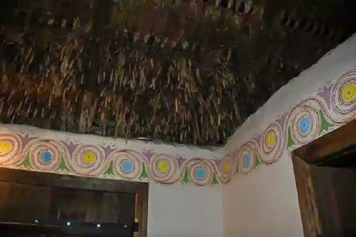 La pièce d’entrée était généralement décorée avec retenue, mais sa place dans la maison restait essentielle. Les ornements faisaient référence à des éléments simples et familiers : la terre, le soleil, le rythme du temps et la continuité de la vie. Disposés autour des ouvertures ou le long des murs, ces motifs marquaient le passage entre l’extérieur et l’espace domestique, comme une frontière symbolique.