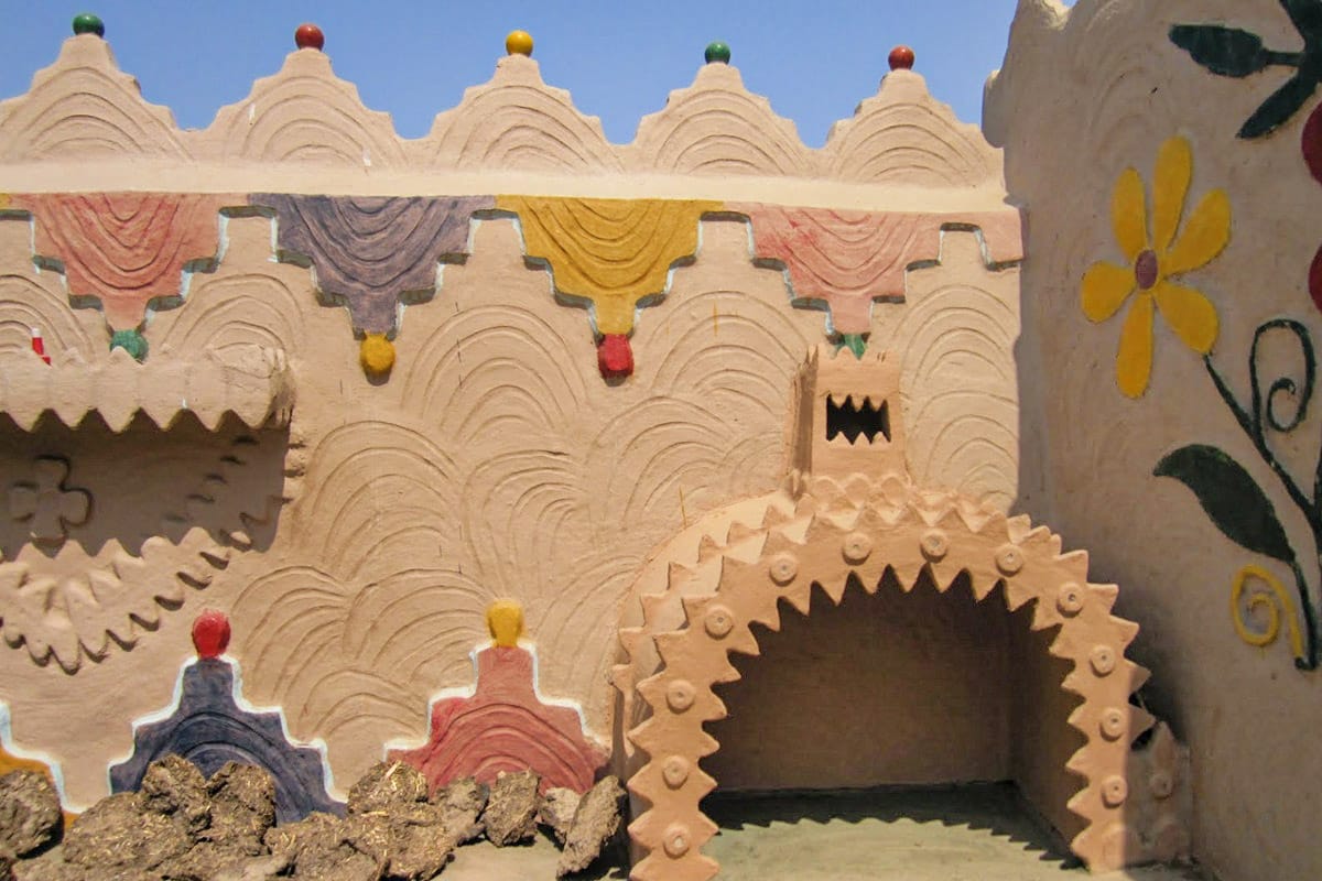 Ce qui caractérise le village de Thatta Kedona, c’est l’esthétique : les façades deviennent tableaux. Les femmes du village sculptent la terre humide pour former des bouquets fleuris, des arabesques, des petits édicules, des frises dentelées et des motifs géométriques. Une fois sèche, la matière reçoit des couleurs éclatantes : rouge coquelicot, jaune moutarde, bleu pastel, vert feuille, rose tendre.