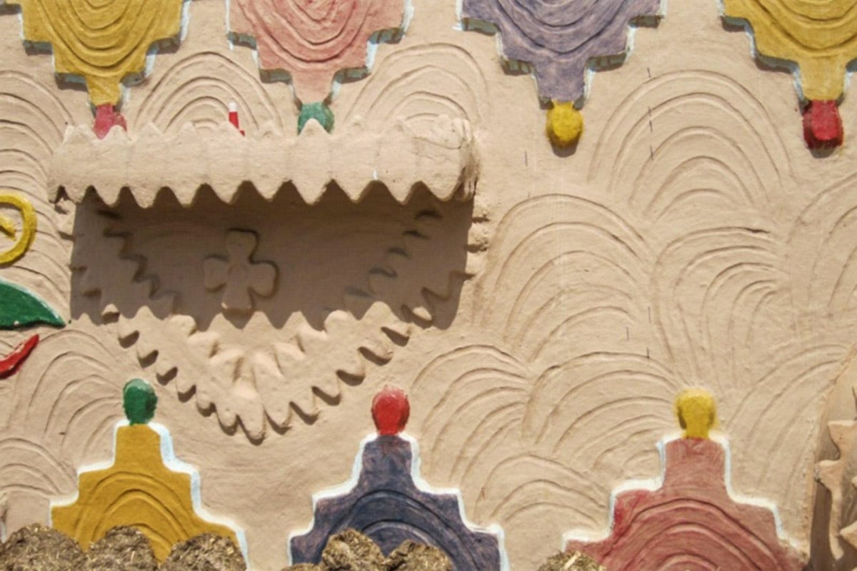 Cette polychromie célèbre la fertilité, les saisons, la maison comme espace sacré. L’intérieur suit la même logique, avec étagères encastrées, niches illuminées et peintures légères qui animent la terre crue. Ici, décoration et construction ne font qu’un, dans une continuité sensible entre technique et poésie.