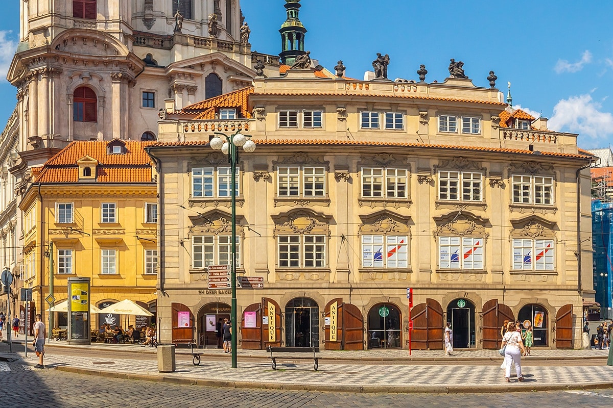 Non loin de là, le palais Grömlingovský, sur la même place, adopte une approche tout aussi rococo mais plus ornementée. Les encadrements ondulent légèrement, les rocailles s’animent sous les fenêtres et les pilastres minces donnent un rythme souple à la façade. Ces deux bâtiments montrent comment le rococo s’est installé à Prague : par touches, sans théâtralité inutile, en privilégiant la délicatesse.