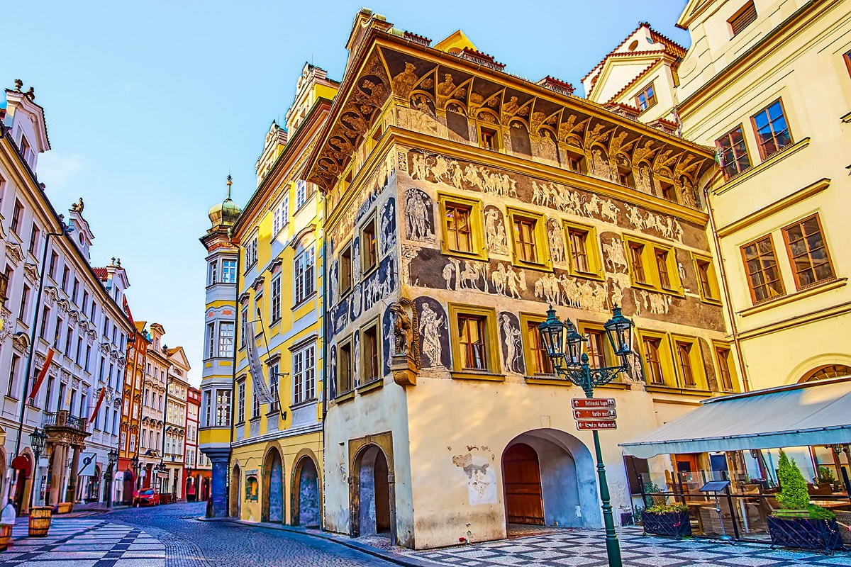 La maison U Minuty, sur la place de la Vieille Ville de Prague, illustre bien cette évolution. Son noyau est gothique, mais sa façade à sgraffites du XVIᵉ siècle lui donne une identité Renaissance claire. Rien d’ostentatoire : une parcelle étroite, deux niveaux lisibles et un décor maîtrisé. Elle prouve que la Renaissance pragoise n’a pas copié l’Italie ; elle l’a traduite à l’échelle de la maison urbaine.
