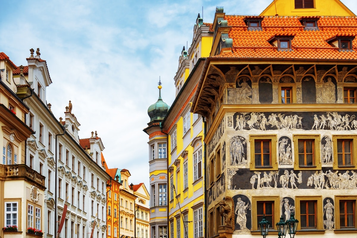 Les couleurs jouent un rôle dans l’identité de Prague. Elles ne sont pas décoratives au hasard : elles suivent une tradition où la teinte exprime l’époque et le goût. Les tons ocre et beige rappellent les reprises gothiques ou Renaissance, souvent patinées par le temps. Les badigeons plus soutenus (rouges brique, jaunes dorés) ont marqué l’essor baroque. Puis viennent les pastels du XVIIIᵉ siècle, typiques du rococo : rose poudré, bleu gris, vert tendre. Ces teintes atténuent la densité urbaine. Elles créent une continuité visuelle entre des bâtiments pourtant très différents dans leurs formes et âges.