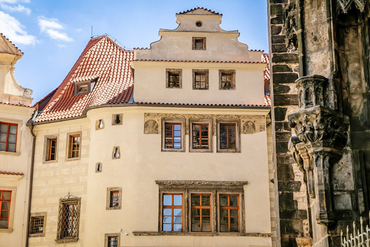 Même si beaucoup ont été transformées, les formes gothiques sont lisibles. Cherchez les arcs brisés au-dessus des portails, les fenêtres étroites profondément ébrasées, les caves voûtées en ogive. Dans certaines ruelles comme Týnská ou Jalovcová, ces indices sont encore en place. Vous les voyez aussi dans les façades plus tardives : un linteau gothique réemployé ou une baie murée trahit une phase ancienne.