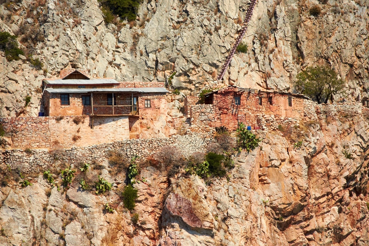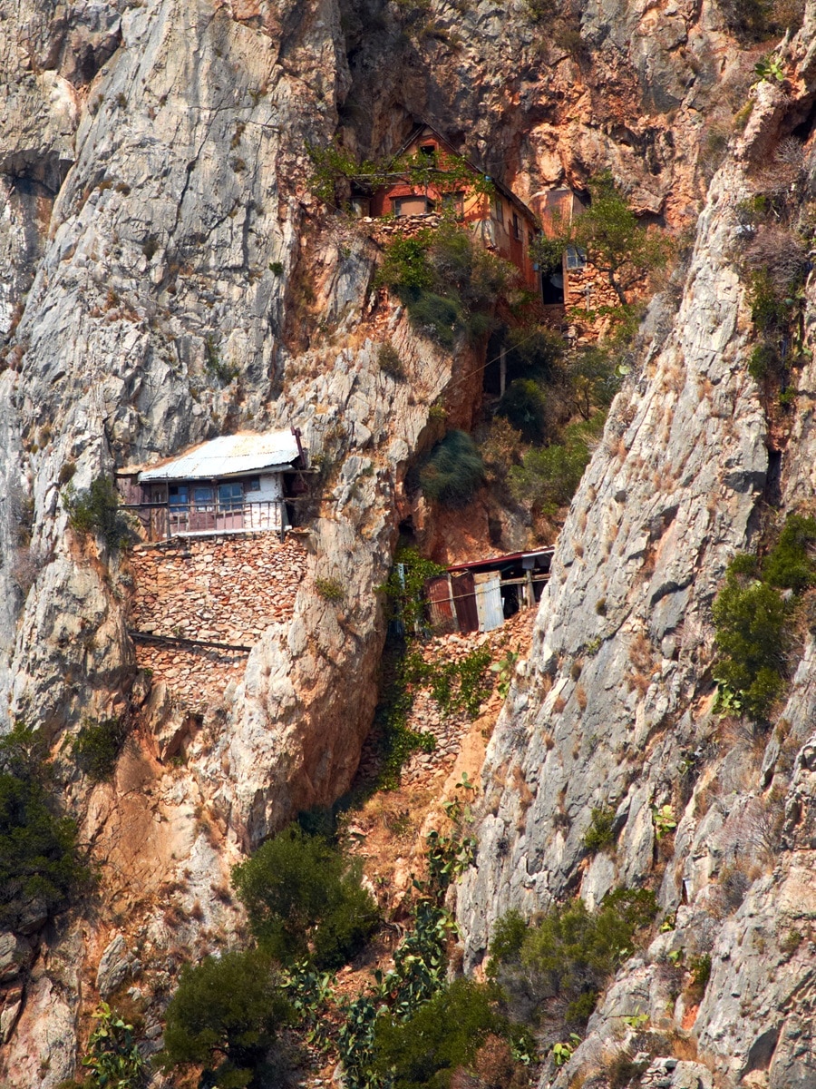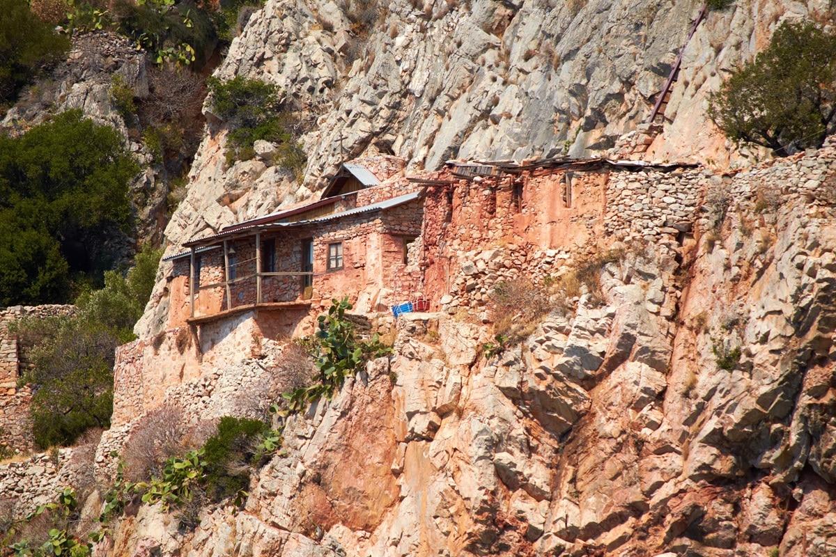 Les maisons des ermites de Karoulia ne répondent à aucun style. Ce sont des refuges improvisés, bâtis là où il y avait de la place, là où un rocher pouvait offrir un minimum d’abri. Les matériaux sont ceux que l’on trouve sur place : bois flotté, pierres, vieilles planches. Tout est récupéré, rien n’est acheté. Parfois, on ajoute une tôle pour renforcer le toit, un bout de corde pour fixer la porte.