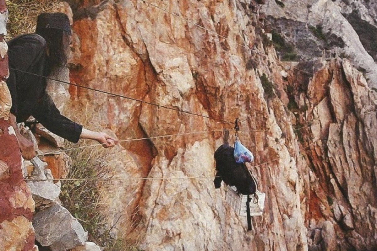 Karoulia, c’est un bout de falaise au sud du mont Athos. Le nom viendrait des poulies (karoules, en grec) utilisées jadis pour faire monter ou descendre des paniers le long des parois abruptes. Ici, il n’y a pas de route, pas de sentier large. Les habitations sont suspendues au-dessus du vide. Ce sont de très petites cabanes, construites à même la roche, à flanc de précipice. L’espace y est compté. Parfois, il n’y a qu’une seule pièce, sombre, avec un lit, une table, une icône, un poêle en fonte. Rien de plus.
