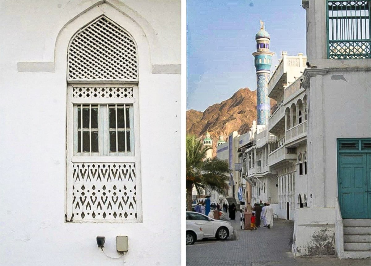 L’un des traits les plus reconnaissables de la corniche de Matrah est la succession de moucharabiehs en bois des façades donnant sur la mer. Ces balcons fermés, appelés localement rawashin, permettaient :
