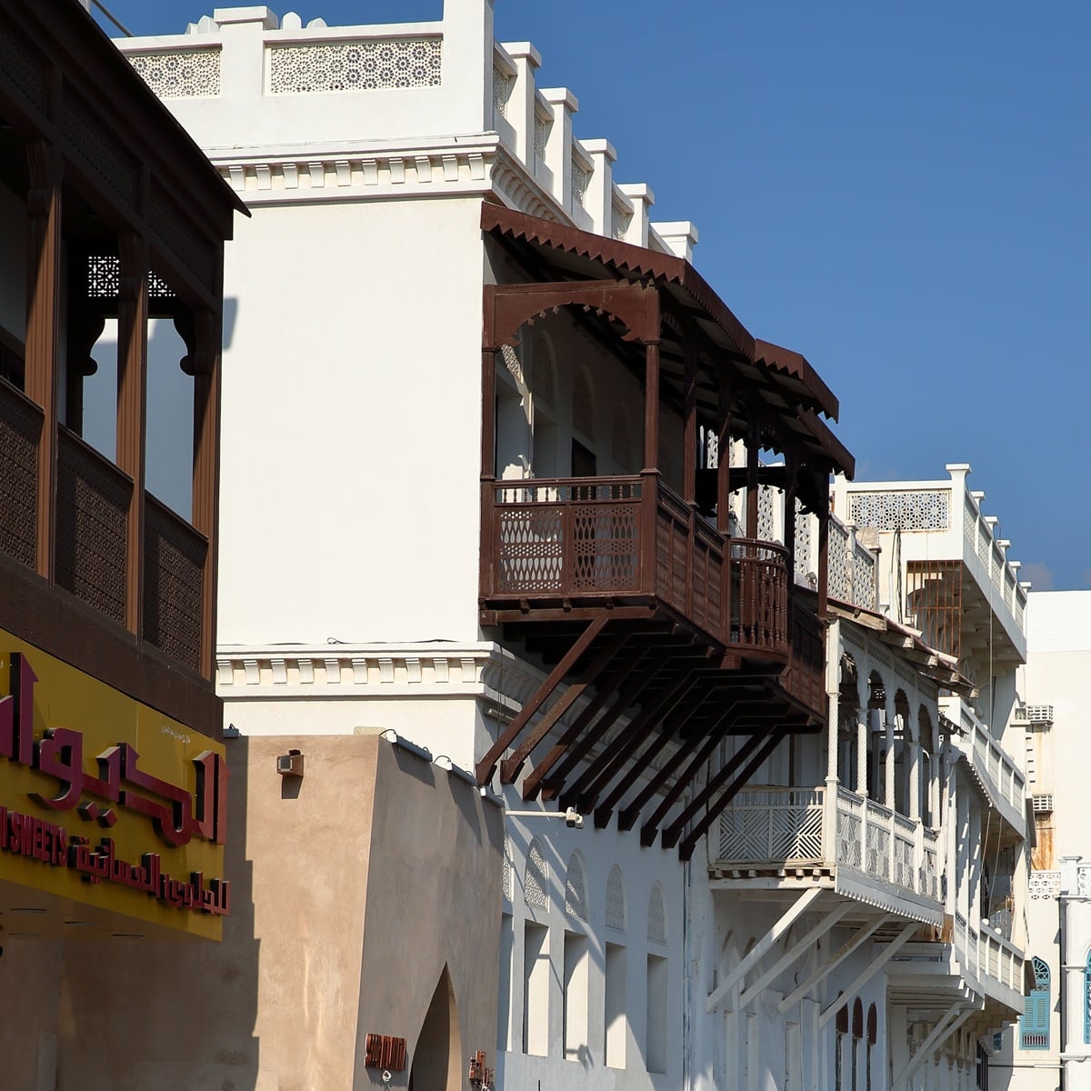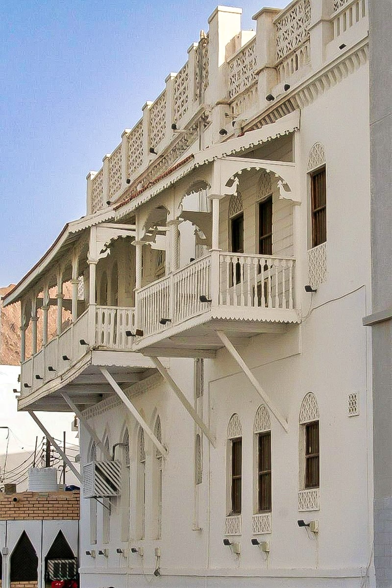 Les anciennes maisons de marchand de Matrah s’étendent le long de la corniche. Matrah est un ancien port de pêche de Mascate, la capitale d’Oman. Ces bâtiments sont situés le long de la zone appelée « la corniche ». Les balcons en bois de ces maisons blanchies à la chaux leur donnent du caractère.