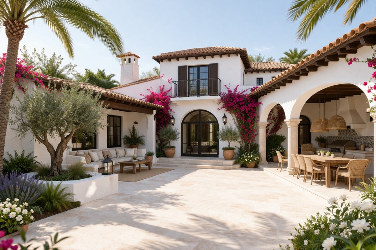 Mais la vraie lecture du style ne passe pas que par la liste des motifs. Elle passe par la composition. Le Mediterranean Revival aime les volumes décalés, les ailes qui s’articulent autour d’une cour, les jeux d’ombre sous les arcades, les percements variés et les vues cadrées depuis une terrasse ou une loggia. La maison donne l’impression d’avoir poussé par ajouts, comme si elle avait déjà une histoire.