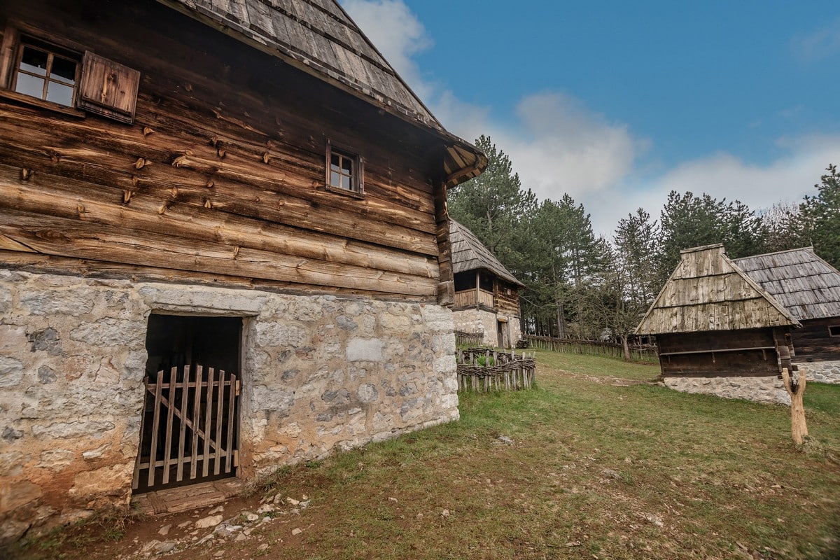 Chaque ferme est un petit monde autonome. On y distingue la kuća, la maison principale, souvent composée d’une seule pièce centrale chauffée par un foyer ouvert, avec un plancher surélevé en bois pour se protéger de l’humidité. À côté se trouvent la magaza, petite construction servant à entreposer la nourriture, et le ambar, le grenier à grain, légèrement surélevé pour éviter l’intrusion des rongeurs. Les bâtiments sont disposés autour d’une cour centrale où la famille vivait, travaillait et recevait. Cette disposition fermée traduit une organisation communautaire et familiale forte.