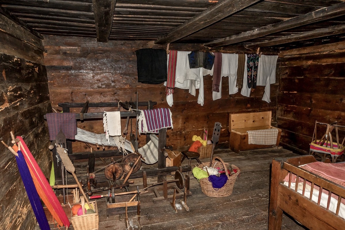 L’intérieur témoigne d’un art de vivre sobre mais ingénieux. Le mobilier, entièrement en bois, se compose de bancs massifs, de coffres finement sculptés et d’étagères où s’alignent des poteries locales. Les textiles jouent un rôle décoratif et fonctionnel : couvertures épaisses, tapis tissés à la main et vêtements en laine tissée rappellent l’importance du pastoralisme dans l’économie locale. Chaque objet, du chaudron en cuivre à la lampe à huile, porte la trace d’un artisanat précis, adapté aux besoins du quotidien.