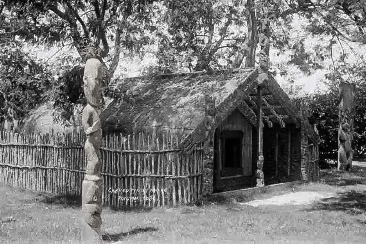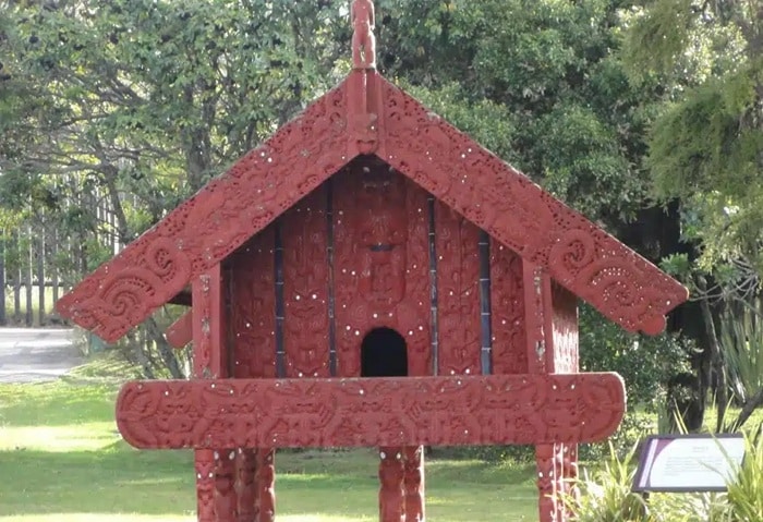 La structure la plus connue construite conformément à la culture maori est le wharenui (littéralement « grande maison »). C’est une maison commune constituée d’une seule grande pièce avec un toit incliné qui s’étend le long du mur avant pour former un porche ouvert. Plus important encore, le whare whakairo est généralement richement décoré, à l’intérieur comme à l’extérieur, avec des images d’ancêtres, de dieux et d’autres figures, et avec des motifs plus abstraits. Le whare whakairo est une version plus grande et plus élaborée des conceptions antérieures de maison telles que le wharepuni (maison de sommeil) et le pātaka (entrepôt). Ce n’est pas une forme ancienne de l’architecture, mais plutôt une structure qui semble être d’abord apparue après le contact avec les Européens, au milieu du 19ème siècle.