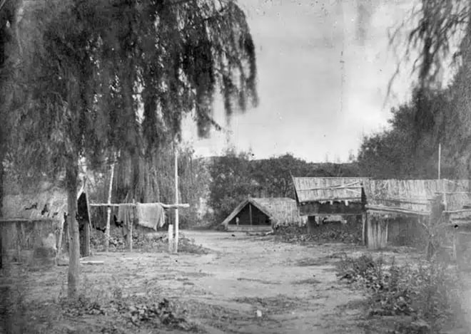 La photo ci-dessous à droite montre un kāinga (village) à Kaiwhaiki, sur les rives de la rivière Whanganui. L’image a été capturée par un soldat colonial pendant les guerres des années 1860 entre les Maoris et les forces coloniales. L’absence de résidents suggère que le village avait été abandonné avant l’arrivée de sa troupe. À l’arrière-plan se trouve un wharenui (maison de réunion) et un pātaka surélevé (entrepôt).