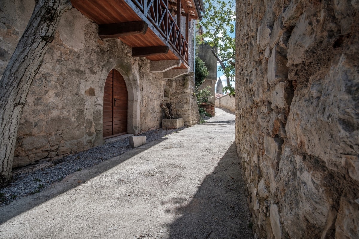 En parcourant les rues de Štanjel, on découvre une succession d’habitations étagées, souvent restaurées après la Seconde Guerre mondiale. Certaines conservent leurs portails cintrés, leurs linteaux gravés de dates ou de symboles, et leurs consoles de pierre en saillie, vestiges de balcons ou d’escaliers extérieurs.