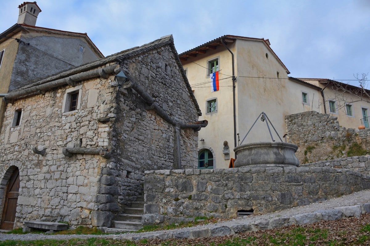 Dans ce territoire karstique où les rivières disparaissent dans le sol, l’eau a toujours été une ressource vitale. Chaque maison traditionnelle possédait son système de récupération et de stockage. Sur la Ramanska hiša, on distingue encore les gouttières en pierre menant à une cuve (ou štirna) placée devant la façade. Cette citerne collectait les eaux pluviales du toit pour les usages domestiques.