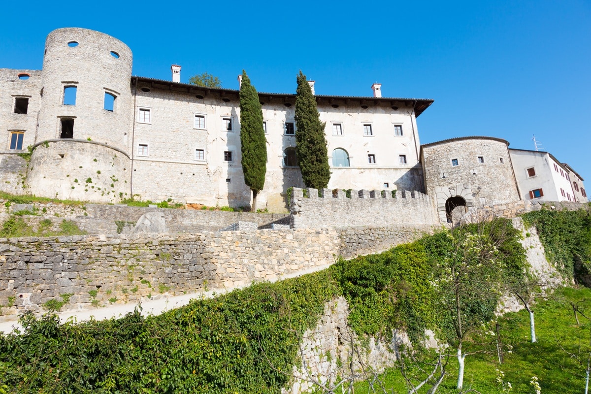L’entrée principale du village s’effectue à travers la tour-portail attenante au Grad Štanjel, le château qui domine le bourg. La forteresse, dont la construction remonte au XVIe siècle, a été agrandie et remodelée à plusieurs reprises. Entre les deux guerres mondiales, l’architecte Maks Fabiani (1865-1962), figure majeure du modernisme centre-européen et disciple d’Otto Wagner, entreprit une restauration partielle du château et du village. Il y intégra sa vision d’un urbanisme harmonieux, où la tradition karstique dialoguait avec les principes modernes de fonctionnalité et de beauté.