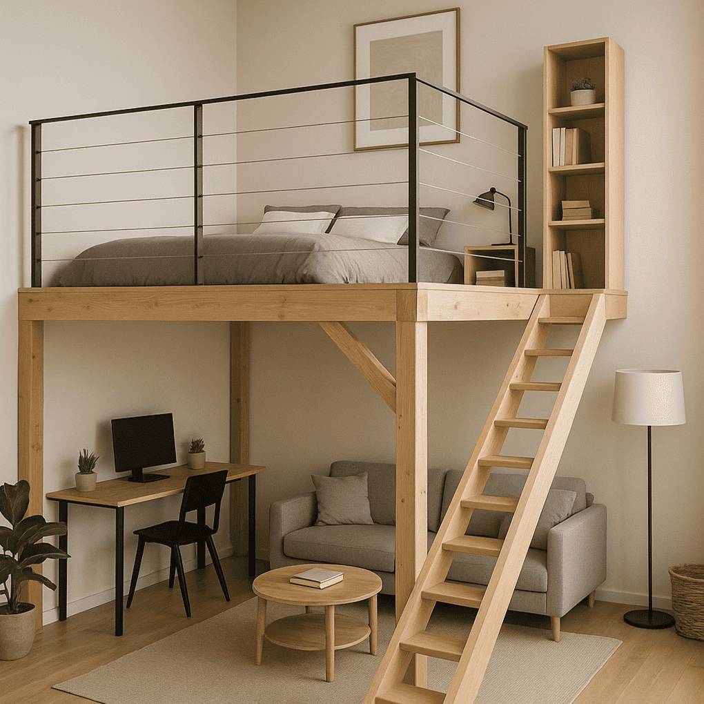 Dans un loft ou un logement avec plafond haut, la plateforme peut devenir une chambre ou un espace nuit pour les invités. On y accède via un escalier ou une échelle, ce qui renforce l’esprit cocooning.