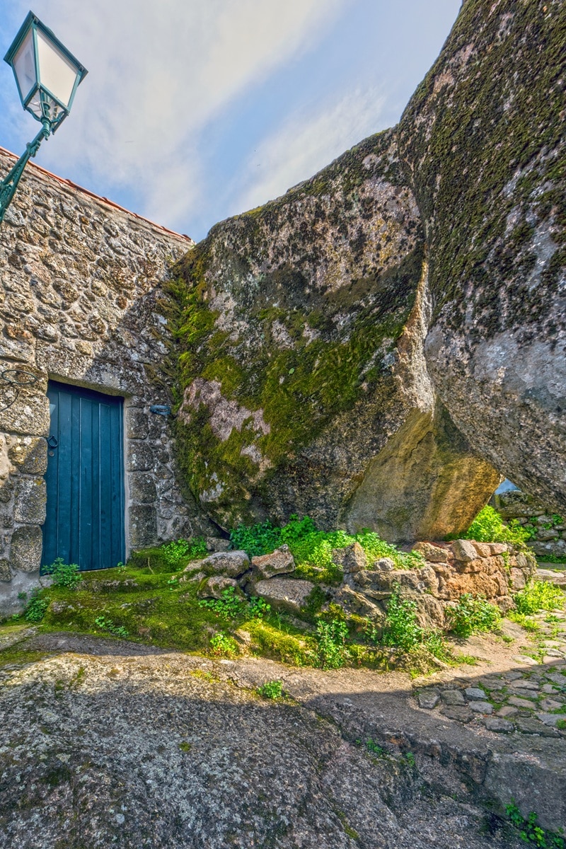 Dans beaucoup de villages, la pierre locale sert surtout à bâtir. À Monsanto, elle sert aussi à « terminer » un bâtiment. On trouve des maisons dont un bloc affleurant remplace un pan de mur. Ailleurs, un énorme rocher surplombe une façade, au point de donner l’impression que la maison est coincée dessous. C’est une façon pragmatique de profiter d’une masse déjà en place, stable, et difficile à déplacer.