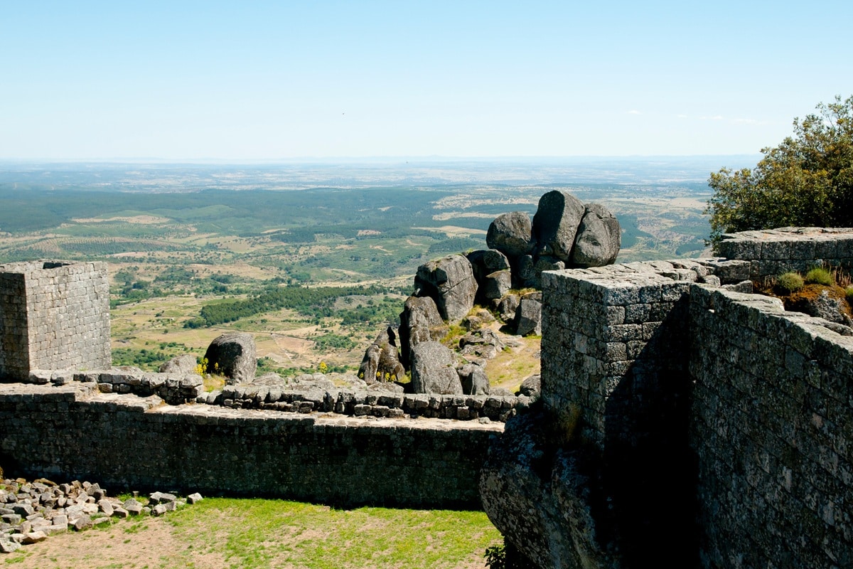 Tout en haut, les ruines du château rappellent que le village de Monsanto n’est pas qu’un décor minéral. Le site possède une histoire militaire très nette : une position de frontière, un contrôle du territoire, une logique de surveillance. Le château a été construit au XIIᵉ siècle par l’Ordre du Temple, et l’enceinte urbaine date du XIIIᵉ siècle, sur ordre de la Couronne, selon la fiche patrimoniale portugaise.