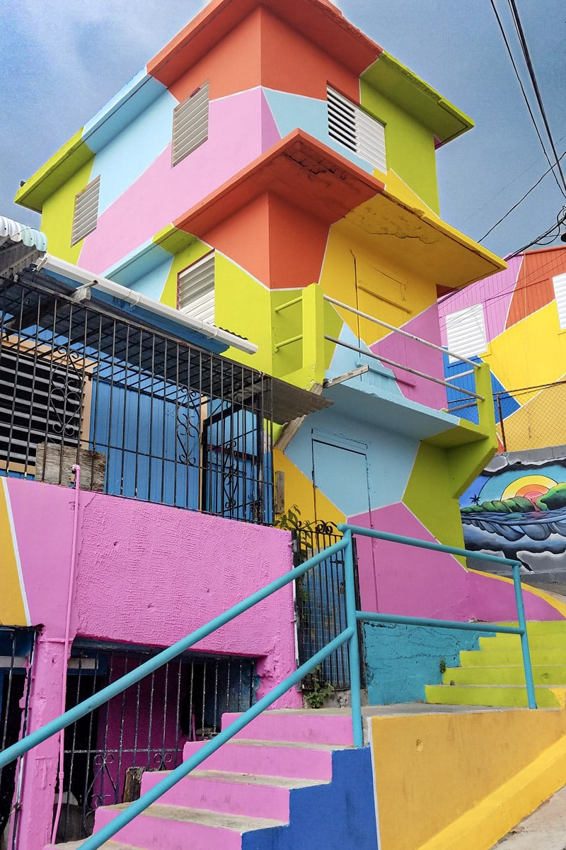 Sur les pentes de La Cantera, le récit est différent. Là, le dessin de la rue et la topographie imposent des maisons compactes, rapprochées, une économie de moyens, des solutions d’ombre et de ventilation à l’échelle du balcon. Le projet Yaucromatic ne gomme pas cette réalité ; il l’assume et la rend visible. Les lignes de couleur suivent les rampes, soulignent un décrochement, contournent une cage d’escalier. Et en reliant chaque lot aux voisins, le motif fabrique un “bâtiment collectif” à ciel ouvert.