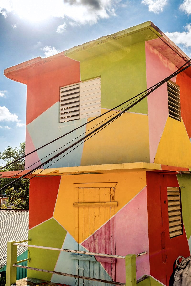 Les teintes ne sont pas posées au hasard sur les murs des maisons de Yauco. Le macromural assemble des formes géométriques qui débordent d’une parcelle à l’autre, avec des contrastes nets : chauds et froids, sourds et vifs, pleins et vides. À midi, la lumière écrase les volumes et vous lisez surtout les couleurs. En fin d’après-midi, les reliefs reviennent : un vert se tend sur un ressaut, un orange casse la pénombre sous un balcon. Le motif n’est jamais identique ; il dépend de l’heure et du point de vue.
