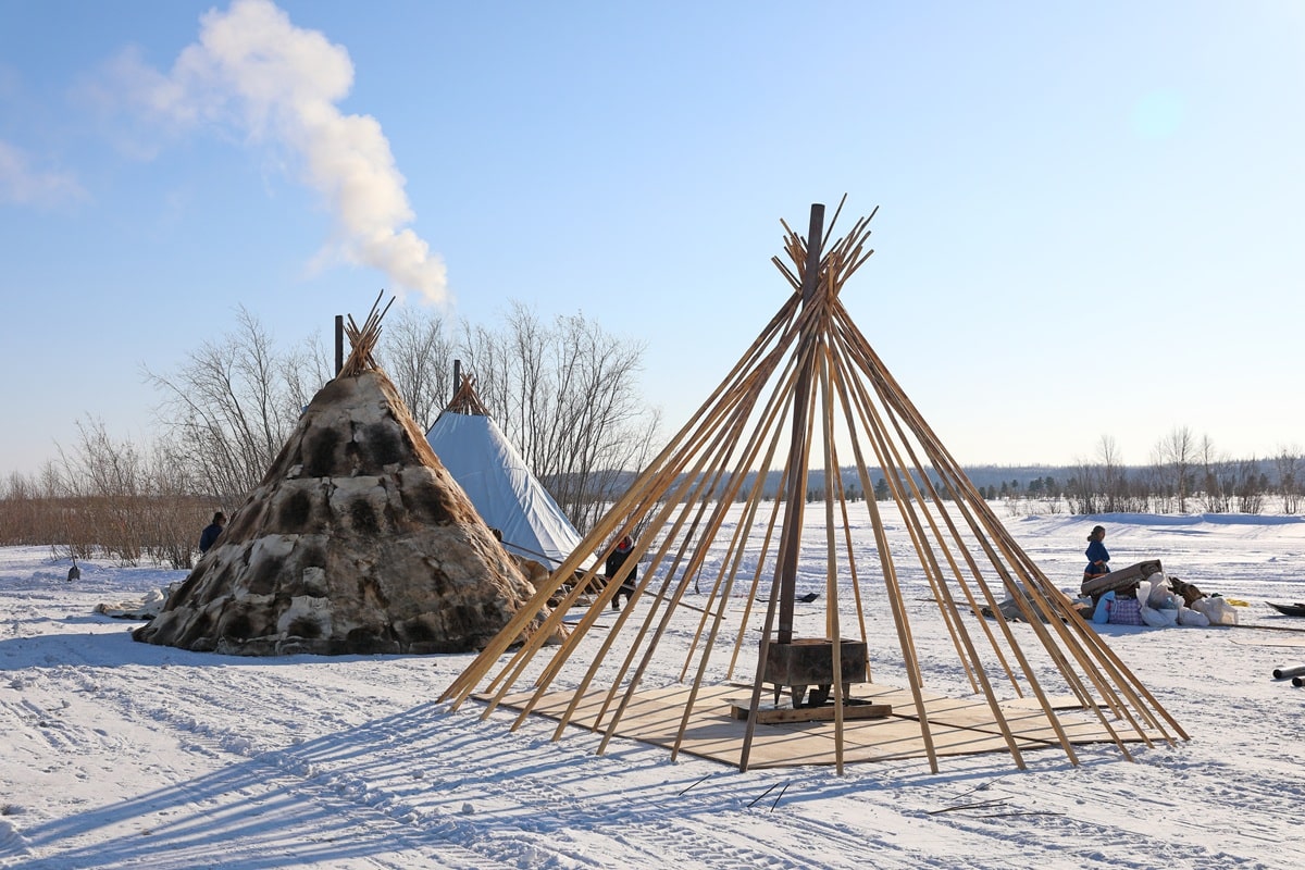 Les Nenets sont un peuple nomade et éleveur de rennes dans le vaste nord de la Sibérie. Ils vivent dans des tchoums, qui sont de grandes tentes ressemblant à des tipis et fabriqués à partir de grands poteaux et de peaux de rennes. Le tchoum traditionnel est constitué de peaux de rennes cousues ensemble et enveloppées autour de poteaux en bois qui sont organisés en cercle.
